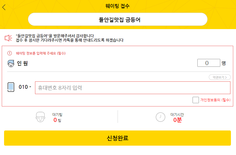 "들안길맛집 금등어"을 방문해주셔서 감사합니다접수 후 잠시만 기다려주시면 카톡을 통해 안내드리도록 하겠습니다