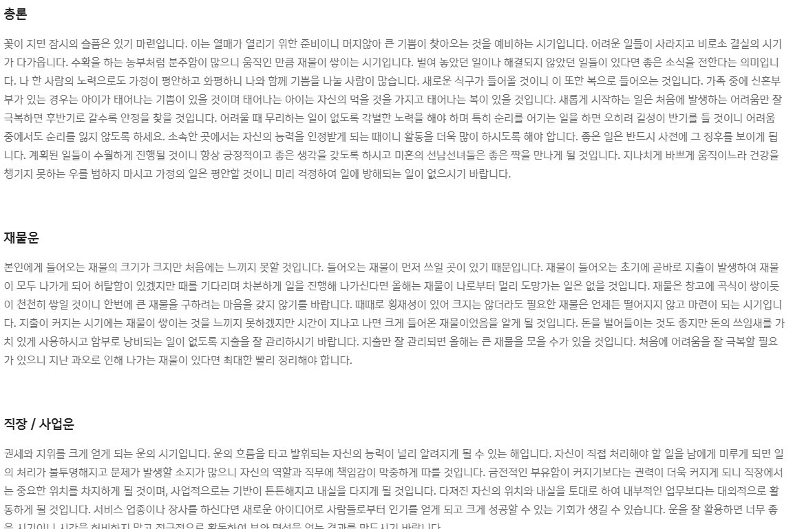 2) 내년도 신년 운세 풀이 결과가 나옵니다. 총론부터 운세, 월별 운세 등을 알 수 있습니다.