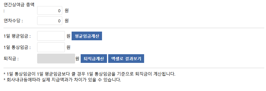 - 연간 상여금 총액, 연차수당을 입력하면 1일 평균임금이 자동 계산됩니다.